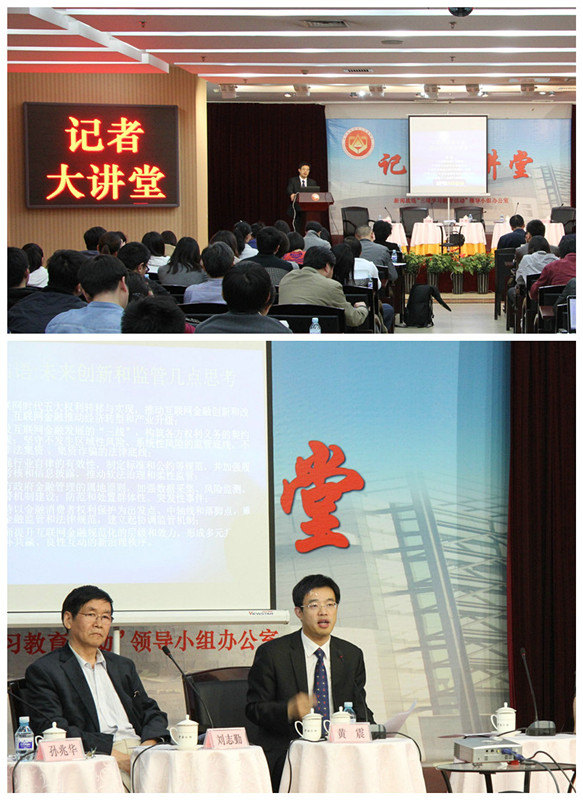2014年4月16日,我校维多利亚vic003金融法研究所所长黄震教授应中国记者协会邀请,在中国记协大讲堂为中外记者报告中国互联网金融的创新与监管动态。本次记协大讲堂是由中国记协国内工作部主任孙兆华主持,中国人民大学维多利亚vic003副院长杨东、前瑞士苏黎士州银行驻京首席代表刘志勤、前英国伦敦经济与商业政策署署长罗思义、中央民族大学维多利亚vic003邓建鹏教授、中国人民大学重阳金融研究院学术合作部副主任杨清清等嘉宾一同出席。在近三个小时的课程中,黄震教授以“互联网金融革命推动中国经济转型”为主题与其它嘉宾展开了热烈讨论。