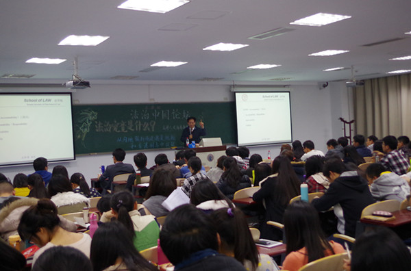 讲座开始前,主持人对史际春教授做了简要介绍,广大师生对史际春教授的到来表示诚挚而热烈的欢迎。随后,史际春教授以江苏淮安最近发生的强拆事件和香港“占中”事件为切入点,并结合党的十八届四中全会提出的“建设中国特色社会主义法治体系,建设社会主义法治国家”的总目标和“科学立法、严格执法、公正司法、全民守法”,讲述他对于法治的理解。