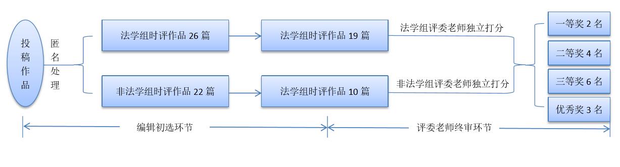 征稿期截止后,组委会统一对对参赛作品进行匿名处理,按主题分为法学组作品和非法学组作品,采用编辑初审和专家评委终审相结合的方式进行评选。
